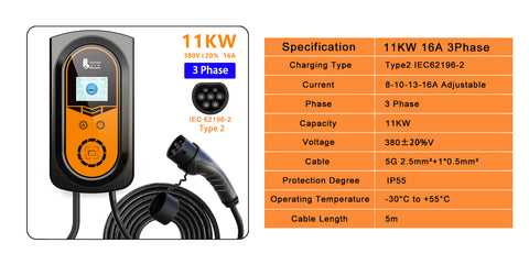 Type 2 EV Charging Station 16A 11KW THREE Phase with 5M Cable - AU STOCK/WTY